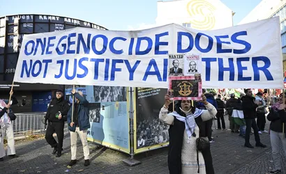 Almanya'nın başkenti Berlin'de Filistin'e destek amacıyla gösteri düzenlendi. Berlin'in Mitte semtindeki Friedrich ve Zimmer caddelerinin kesiştiği meydanda Filistin'i desteklemek ve İsrail'in işlediği soykırımı protesto etmek için çok sayıda kişi toplandı.