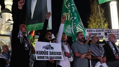Beşiktaş'ta Peygamber Sevdalıları Derneği ve Özgür Kudüs Platformu üyeleri, Küresel Sumud Filosu'na destek için Barbaros Hayrettin Paşa Camisi önünden İsrail Konsolosluğu'na yürüdü.