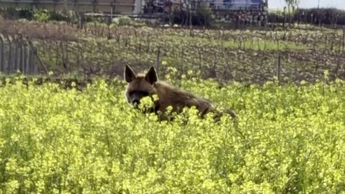 Besni'de Nesli Tehlikede Çizgili Sırtlan Sarı Çiçekli Tarlada Görüntülendi