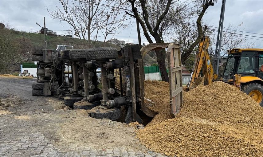 Olay, Gürpınar Mahallesi Pekmez Caddesi'nde gerçekleşti. İSKİ ekiplerinin altyapı çalışmaları kapsamında alana mıcır dökmek üzere gelen 34 GF 4291 plakalı hafriyat kamyonu, yolda oluşan çökme sonucunda devrilerek yolda yan yattı.