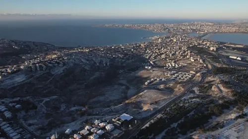 Beylikdüzü ve Büyükçekmece’de gece görülen kısa süreli kar ve soğuk hava sonrası oluşan kar örtüsü, sabah dron ile havadan görüntülendi.