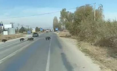 Konya'nın Beyşehir ilçesinde, Beyşehir-Isparta kara yolunda seyir halinde olan bir aracın sürücüsü, yola aniden çıkan yaban domuzu sürüsünü cep telefonuyla kaydetti. Kayıtta sürücünün, "burayı domuzlar bastı" sözleri de duyuluyor.