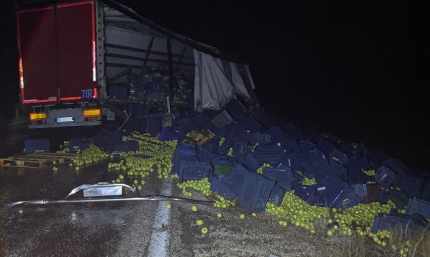 Edinilen bilgiye göre, Hüyük-Konya kara yolu üzerinde seyir halinde olan O.T. (43) yönetimindeki 38 JM 630 plakalı meyve yüklü tır, yağışlı hava nedeniyle sürücünün direksiyon hakimiyetini kaybetmesi sonucu bariyerlere çarparak makasladı. Kaza esnasında dorsede bulunan 38 ALH 529 plakalı dorsedeki elmalar etrafa saçıldı.