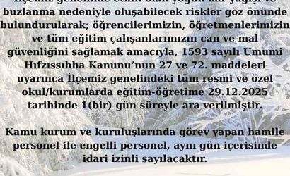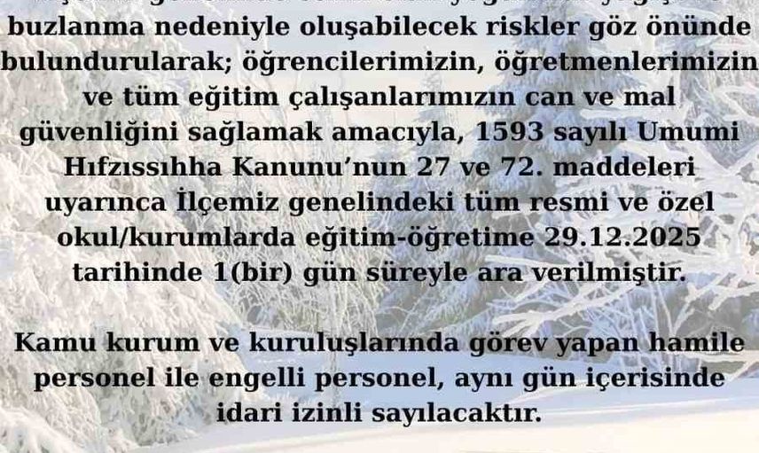 "Etkili olan kar yağışı nedeniyle buzlanma ve don olayına karşı oluşabilecek risk göz önünde bulundurularak, öğrencilerimizin ve öğretmenlerimizin tüm eğitim çalışanlarımızın can ve mal güvenliğini sağlamak amacıyla 1593 sayılı Umumi Hıfzıssıhha Kanunu'nun 27 ve 72'nci maddeleri uyarınca ilçemiz ve genelindeki tüm resmi ve özel okullarda eğitim ve öğretime 1 gün ara verilmiştir" denildi.
