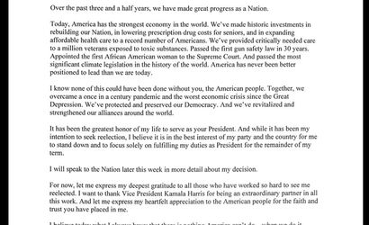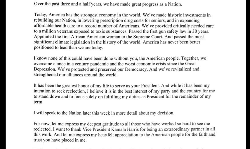 ABD Başkanı Joe Biden, seçim yarışından çekilme kararını duyurdu ve Kamala Harris'in başkanlık adaylığını desteklediğini belirtti. Biden, sosyal medya üzerinden yaptığı açıklamada, 2020 seçimlerinde Harris'i başkan yardımcısı adayı olarak seçmenin en doğru karar olduğunu ifade etti.