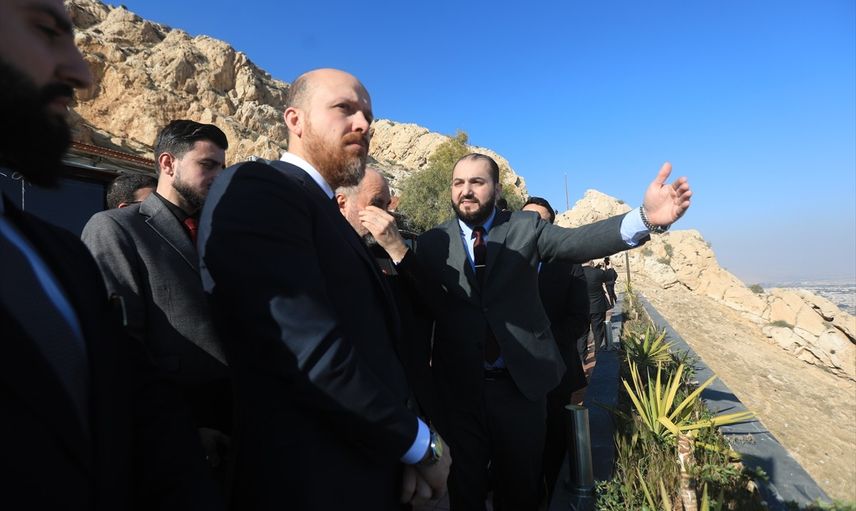 İlim Yayma Vakfı Mütevelli Heyeti Başkanı Bilal Erdoğan (sol 2) ve beraberindeki Türk heyet, Cumhurbaşkanı Ahmed Şara ile görüşmenin ardından Şam'ın terası konumundaki Kasyun Dağı'nı ziyaret etti.