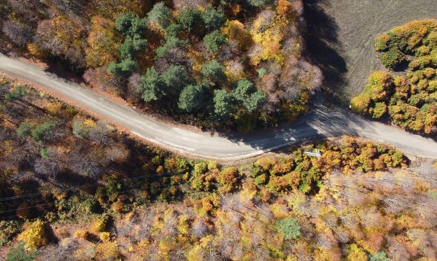 Bölgedeki sonbahar görüntüleri dronla havadan kaydedildi; bu görüntüler orman dokusunun ve renk geçişlerinin etkisini ortaya koyuyor.