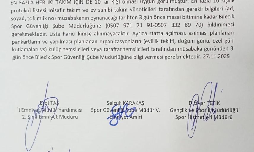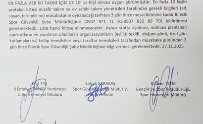 27 Kasım tarihli ve Emniyet Müdür Yardımcısı 2. Sınıf Emniyet Müdürü Erol Taş imzalı yazıda, ilde yapılacak futbol müsabakalarında 1 Ekim 2025 tarihli İl Spor Güvenlik Kurulu kararlarına istinaden protokol sayılarının her iki takım için en fazla 10'ar kişi olarak belirlendiği, bu kişilerin müsabaka tarihinden 3 gün önce Bilecik Spor Güvenliği Şube Müdürlüğüne bildirilmesi gerektiği ve liste harici kimsenin alınmayacağı bildirildi. Ayrıca statta açılması planlanan pankartlar ile yapılması planlanan organizasyonların da müsabaka gününden 3 gün önce bildirilmesi gerektiği kaydedildi.