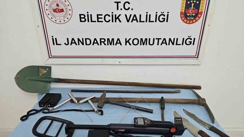 Bilecik İnhisar'da Koyunlu Köyü Hamamönü Mevkiinde jandarma, 5 kişiyi izinsiz kazı yaparken suçüstü yakaladı; çok sayıda dedektör ve kazı aleti ele geçirildi.