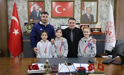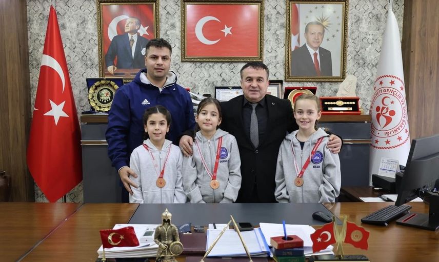 Bilecik'te, Yüzme Federasyonu 7-9 Yaş müsabakalarında dereceye giren minik sporcular, Gençlik ve Spor İl Müdürü Ramazan Demir'i ziyaret etti. Ziyarette; Ada Cicili, Defne Hüma Şakar ve Elif Bilge Gürer ile antrenörleri Uğur Özdemir hazır bulundu.