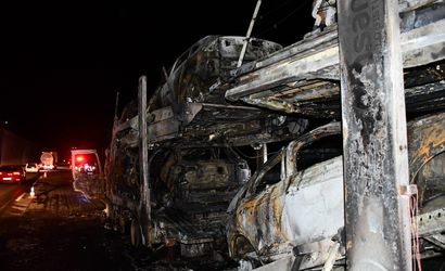 Bilecik'te, seyir halindeyken alev alan tır ve taşıdığı otomobiller kullanılamaz hale geldi.
