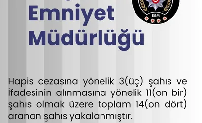 Çalışmalar sonucunda son 1 hafta içinde toplam 14 şüpheli yakalandı. Bunların 3'ü kesinleşmiş hapis cezası bulunan kişiler, 11'i ise ifadelerinin alınmasına yönelik aranan şahıslar olarak kaydedildi.