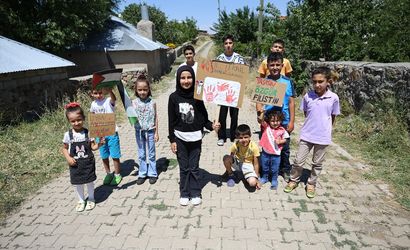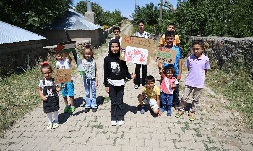 İsrail'in saldırılarını sürdürdüğü Filistin'e destek için yaptıkları yürüyüş sosyal medyada yer alan Bingöllü çocuklar, "Özgür Filistin" mesajı verdi. Çocuklar, ellerinde Türk ve Filistin bayrakları ile kartondan hazırladıkları dövizlerle köyde gerçekleştirdi.