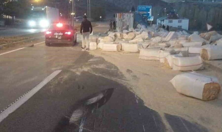 Bingöl-Erzurum karayolu Ilıcalar mevkiinde gerçekleşen kazada, maddi hasar meydana geldi. Edinilen bilgiye göre, 12 AFN 110 plakalı saman yüklü kamyon sürücüsünün direksiyon hakimiyetini kaybetmesi sonucu kontrolden çıkarak devrildi.