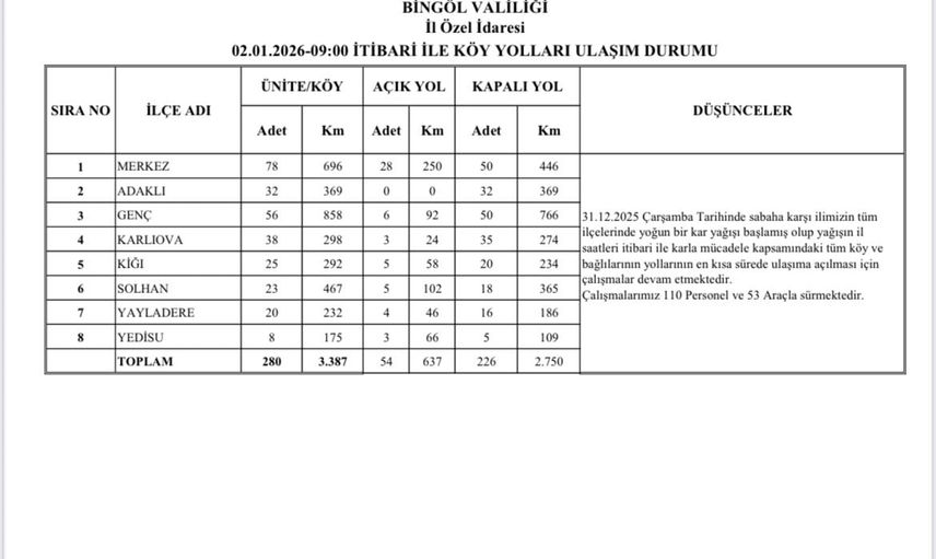 Çalışmalar kapsamında şu ana kadar 54 köy yolu ulaşıma açıldı. Buna karşın, haber kaynağının bildirdiğine göre kapalı olan 226 köy yolunda çalışmaların sürdüğü ifade edildi.