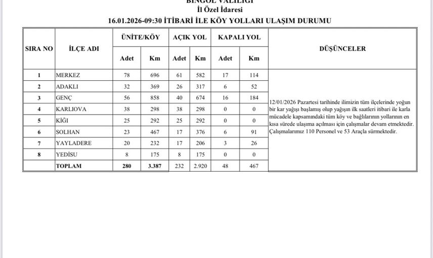 Çalışmaları yürüten İl Özel İdaresi, sahada 110 personel ve 53 araç ile görev yapıyor. Ekipler, karla mücadeleyi aralıksız şekilde sürdürerek kapanan güzergahların yeniden ulaşıma açılmasını sağlıyor.