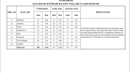 Bingöl'de kar çalışmalarıyla 280 köy yolundan 232'si ulaşıma açıldı; 48 köy yolunda çalışmalar İl Özel İdaresi ekipleri tarafından sürdürülüyor.