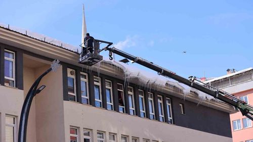 Bingöl'de eksi 12'lere düşen soğuklarla oluşan metrelerce buz sarkıtları, Bingöl Belediyesi İtfaiye Müdürlüğü ekipleri tarafından okullar ve kamu binalarından temizlendi.