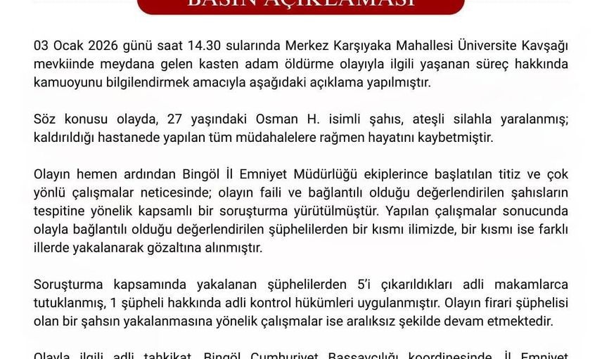 Bingöl Valiliği tarafından yapılan açıklamaya göre, 03 Ocak 2026 günü saat 14.30 sularında merkez Karşıyaka Mahallesi Üniversite Kavşağı mevkiinde kasten adam öldürme olayı meydana geldi. Olayda 27 yaşındaki Osman H. isimli şahıs ateşli silahla yaralanmış, kaldırıldığı hastanede yapılan tüm müdahalelere rağmen hayatını kaybetmiştir.