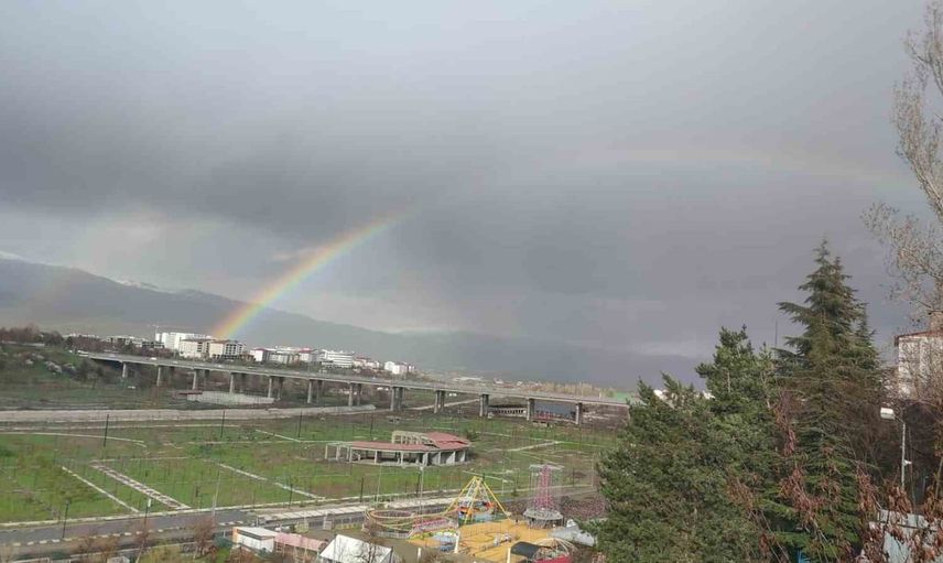 Bingöl'de etkili olan yağmurun ardından güneşin yüzünü göstermesiyle gökyüzünde beliren gökkuşağı, kentin farklı noktalarından izlenebilen renkli görüntüler oluşturdu.