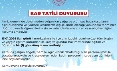 Kararda, il merkezindeki ve ilçelerdeki tüm resmi ve özel örgün ve yaygın eğitim kurumları ile kreş ve gündüz bakımevlerinin kapalı olacağı belirtiliyor. Valiliğin duyurusunda ayrıca, belirlenen kategorideki kamu çalışanlarının da 13.01.2026 Salı günü idari izinli sayılacağı vurgulanmıştır.