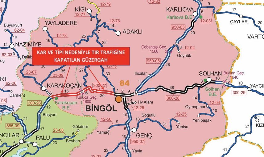 Valilikten yapılan açıklamada, "Bingöl-Elazığ Devlet Yolunun 0-51 km’leri arası (Bingöl Sancak kavşağı ile Karakoçan ayrım kavşağı arası) yoğun kar yağışı ve tipi nedeniyle saat 18.30 itibarıyla tır trafiğine kapatılmıştır" denildi.