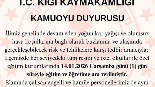 Bingöl'ün Kiğı, Karlıova ve Adaklı ilçelerinde devam eden kar yağışı nedeniyle 14 Ocak 2026 Çarşamba günü tüm eğitim kurumlarında eğitime 1 gün ara verildi.