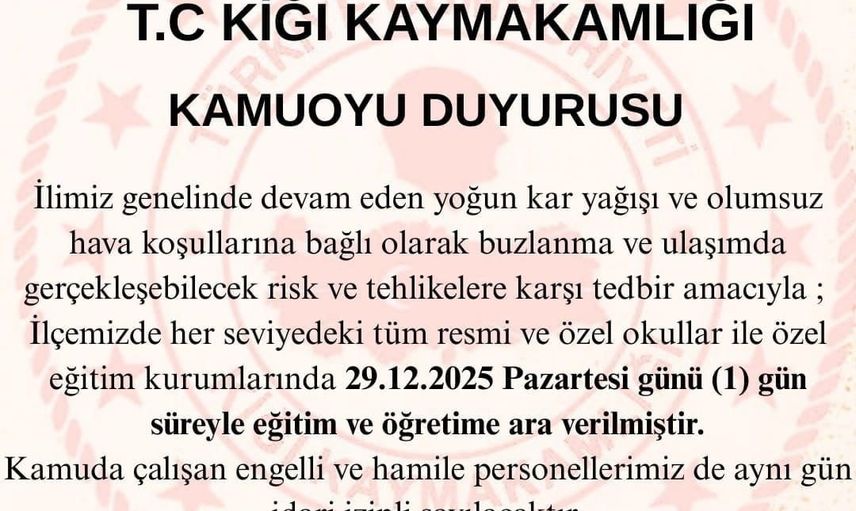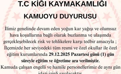 Kiğı Kaymakamlığı ve Adaklı Kaymakamlığı tarafından yapılan açıklamada, Bingöl genelinde etkisini sürdüren yoğun kar yağışı, buzlanma ve ulaşımda yaşanabilecek riskler nedeniyle tedbir amaçlı karar alındığı duyuruldu.