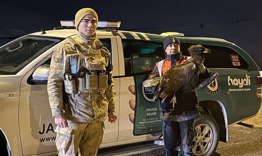 Erzurum'un Çat ilçesinde, jandarma ekiplerinin dikkatli gözleri sayesinde bitkin halde bulunan kara akbaba, bakım ve beslenme sürecinin ardından doğaya salındı.