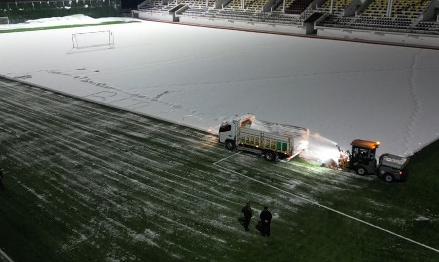 Bitlis Gençlik ve Spor İl Müdürlüğü ekipleri, futbol karşılaşmalarının aksamaması için Bitlis Eren Stadyumu zemininde kar temizleme çalışması başlattı.
