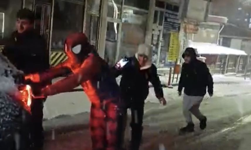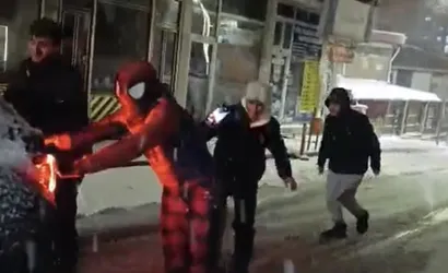Bitlis'te etkili olan yoğun kar yağışı sırasında yolda ilerleyemeyen sürücünün yardımına 'Örümcek Adam' kostümlü Ayaz Salih Koç yetişti.