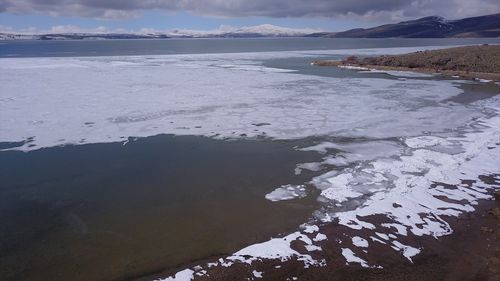 Bitlis'in Ahlat ilçesindeki Nazik Gölü'nde, havanın ısınmasıyla birlikte buzlar kısmen erimeye başladı.