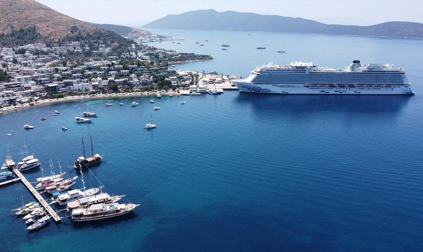 Muğla'nın Bodrum ilçesine ilk kez gelen AROYA Cruises'de bulunan yolcular, bando ve halk oyunları ekibiyle karşılandı, kırmızı halı serilen yolculara yerel ürünler ikram edildi.