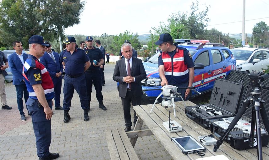 Muğla'nın Bodrum ilçesinde jandarma ekipleri orman yangınlarına karşı havadan denetimlerini artırdı. Kırsalda jandarma ekipleri yaya ve araçla denetimlerinin yanı sıra havadan da termal kameralı dronlarla bölgeyi tarıyor. Bodrum Kaymakamı Mustafa Çit (sağda), Bodrum'un Çamlık Mahallesi'ndeki uygulama yapan ekipleri ziyaret ederek, bilgi aldı.