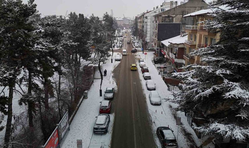 Kartpostallık manzaralar ortaya çıktı; binaların çatıları, parklar ve yeşil alanlar karla kaplanırken, yağışın oluşturduğu görsel şölen dron ile görüntülendi.