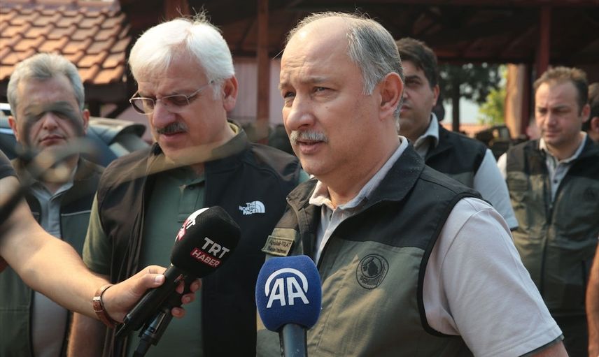 Bolu'nun Göynük ilçesinde ormanlık alanda çıkan yangını söndürme çalışmaları 22 saattir devam ediyor. Tarım ve Orman Bakan Yardımcısı Abdulkadir Polat (sağda) ile Bolu Valisi Erkan Kılıç (solda) gazetecilere bilgi verdi.