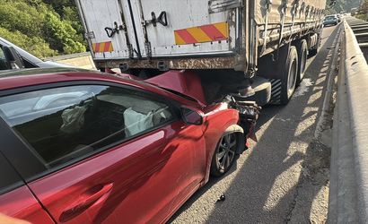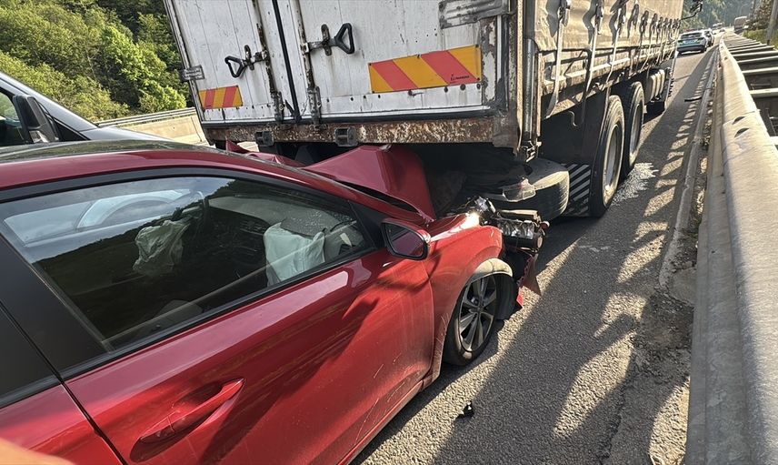 Kaza sonrası otomobil, kamyonun altında sıkışırken, kamyon sürücüsü araçlarını emniyet şeridine çekerek 112 Acil Çağrı Merkezi'ne haber verdi.