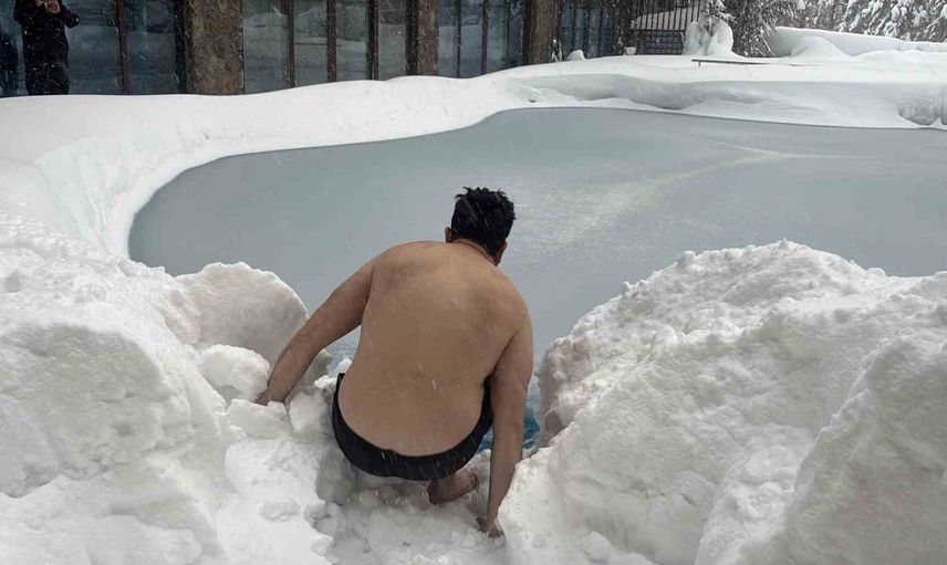 Bolu Dağı'nda eksi 10 derecede otel havuzuna giren tatilci