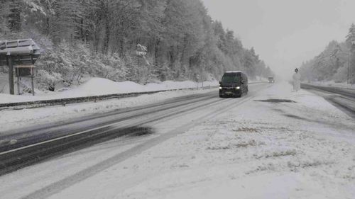 Bolu Dağı'nda gece başlayan kar yağışı aralıklarla etkili oluyor; Karayolları ekipleri D-100 kara yolunda küreme ve tuzlama çalışması yapıyor.