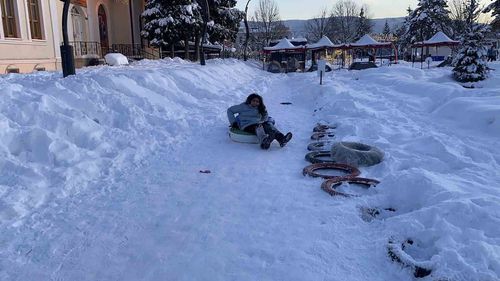 Bolu Kent Meydanı’nda karla dolan merdivenleri şambrel, poşet ve kızaklarla kayarak kullanan çocuklar, şehir merkezindeki 65 cm'yi aşan karın keyfini çıkardı.