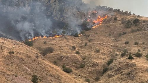 Afyonkarahisar Bolvadin Kemerkaya köyü Yapraklı mevkisinde çıkan örtü yangınına 15 itfaiye, 6 arazöz, 2 su ikmal aracı, dozer, treyler ve helikopter müdahale ediyor.