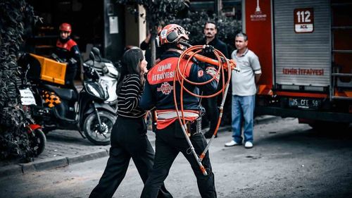 Bornova'da 7 katlı iş hanında çıkan yangında itfaiye ekipleri 12 kişiyi tahliye etti; alevler yaklaşık 12 dakikada kontrol altına alındı.