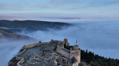 Sinop'un Boyabat ilçesindeki 135 metre yüksekliğindeki Boyabat Kalesi, sabah saatlerine kadar etkili olan sis altında dron ile havadan görüntülendi.