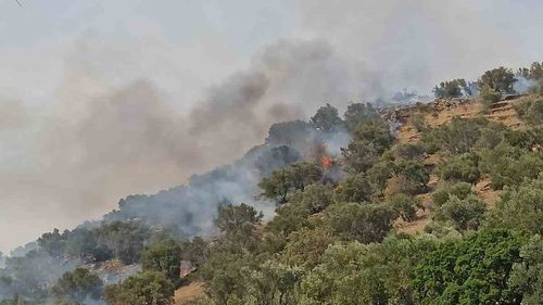 Aydın'ın Bozdoğan ilçesi Kavaklı Mahallesi'nde çıkan orman yangını, rüzgarın etkisiyle hızla yayıldı; itfaiye ve orman ekiplerinin müdahalesi devam ediyor.