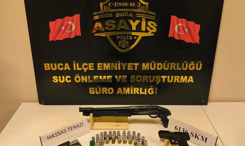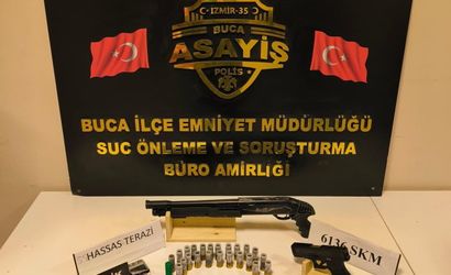 İzmir'in Buca ilçesinde, İl Emniyet Müdürlüğü Buca İlçe Emniyet Müdürlüğü ekipleri tarafından bir adrese düzenlenen operasyonda ruhsatsız silah ve mühimmat ele geçirildi.