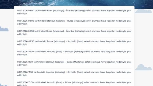 BUDO, 3 Ocak 2026 Cumartesi günü olumsuz hava şartları nedeniyle Bursa—İstanbul ve Armutlu hatlarında karşılıklı toplam 8 seferi iptal etti.