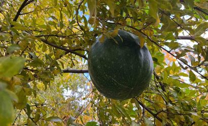 Denizli’nin Buldan ilçesi Turan Mahallesinde bahçeye ekilen kabak bitkisi, yayılıp uzanarak nar ağacının tepesine kadar ulaştı ve burada meyve verdi. Bahçe sahibi, toprakta başlayan kabak sürgünlerinin ağaçlara tırmanarak meyve bağladığını fark etti.