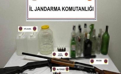 Aramalarda ele geçirilenler arasında 3 litre sahte rakı, 10 litre etil alkol, 7 adet alkol aroması, 15 adet boş alkol şişesi, 1 adet havalı tüfek, 1 adet yivsiz av tüfeği ve 53 adet av tüfeği fişeği bulunuyor.