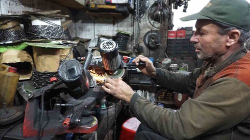 Burdur Gölhisar'da çatıdan düşme sonucu yüzde 94 engelli kalan marangoz Hüseyin Erkal, tekerlekli sandalyeyle odun motoru ve süt sağım makinesi tamiri yaparak çalışıyor.
