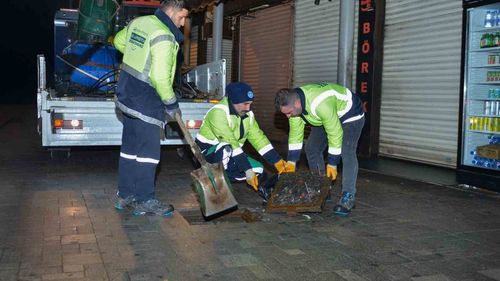 Bursa Büyükşehir ekipleri, Tarihi Çarşı ve Hanlar Bölgesi'nde gece çalışmalarında mazgalları temizleyerek olası su baskınlarına karşı önlem aldı.